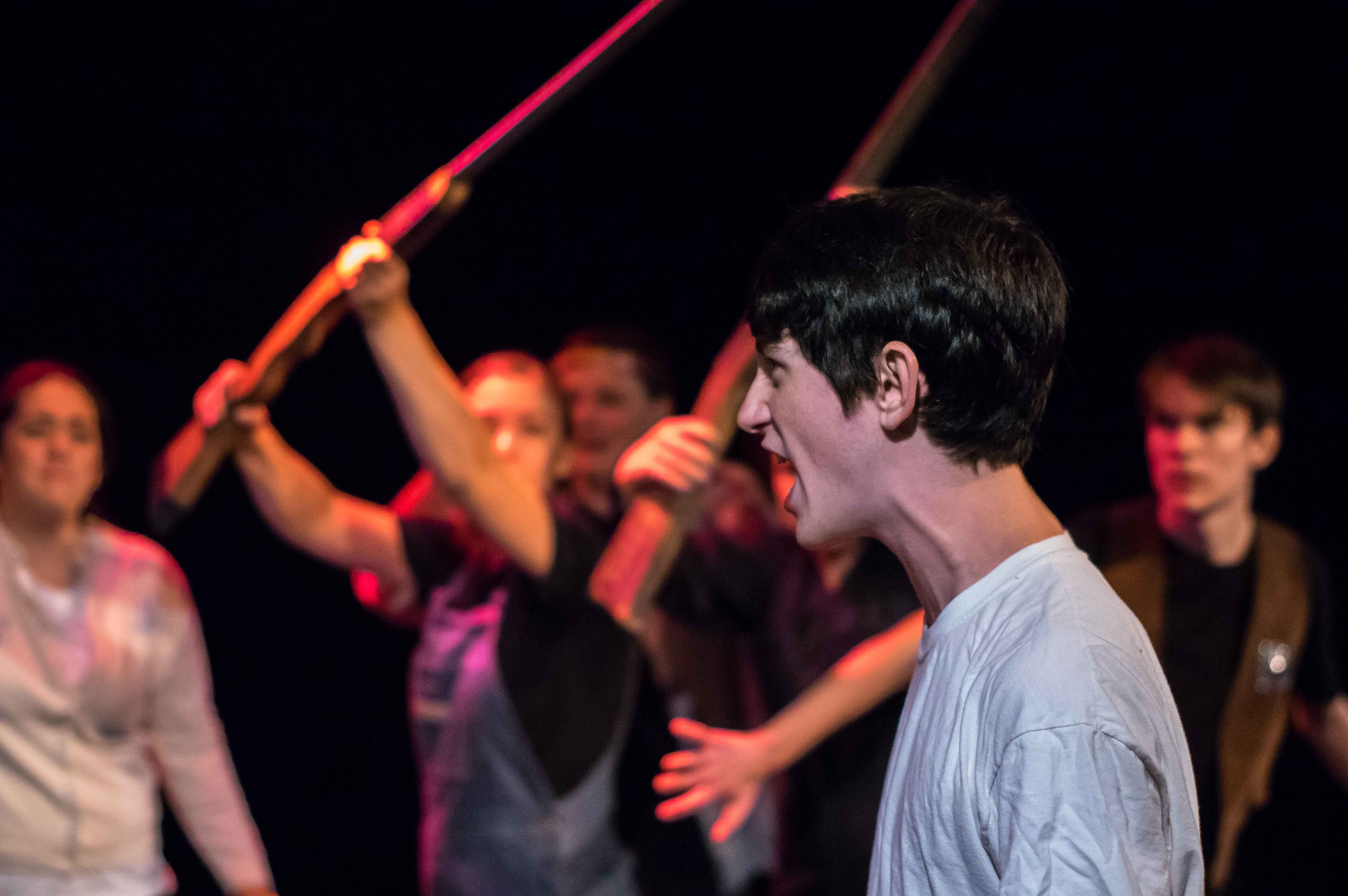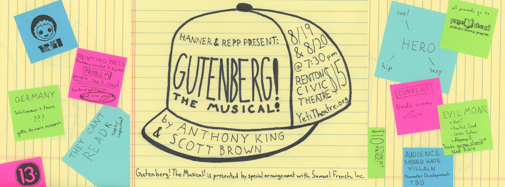 GUTENBERG! THE MUSICAL! is a musical parody which takes the form of a backers’ audition for a new musical about Johannes Gutenberg. Two aspiring playwrights present their historically inaccurate interpretation of the invention of the printing press. The composer Bud and librettist Doug completely believe in the show and will do anything to get it to Broadway. They craft and perform an egotistic yet passionate Gutenberg, a Satan-worshiping monk who wants to keep people from reading, and a full cast of other wacky characters. The night of their piece’s public debut, not only do they have to present the show’s songs and scenes, but they also have to explain the “brilliant” motivations behind each part to convey the full meaning to their audience.